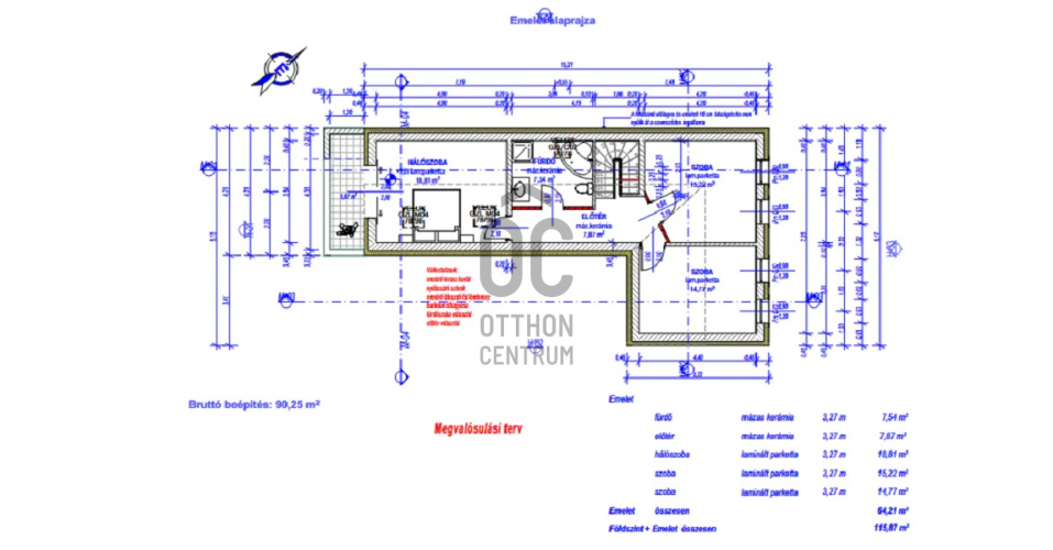 Az emeleten három teljes értékű háló valamint egy több mint 7 nm-s fürdő lett kialakítva.