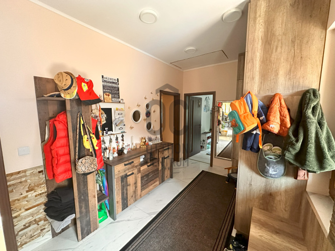 Az aranytölgy színezésű, három rétegű műanyag nyílászárók beépített szúnyoghálókkal, elektromos redőnyökkel és márványlap párkányokkal felszereltek. A három utcai ablak hangszigetelt és fóliázott. Kamerarendszer, riasztó, nyitásérzékelők gondoskodnak az otthon biztonságáról. A ház villanykapcsolói érintős üveglaposak. A padlóburkolat nagyrészt Tubadzin kerámia, a hálószobák és a gardrób laminált parkettásak.