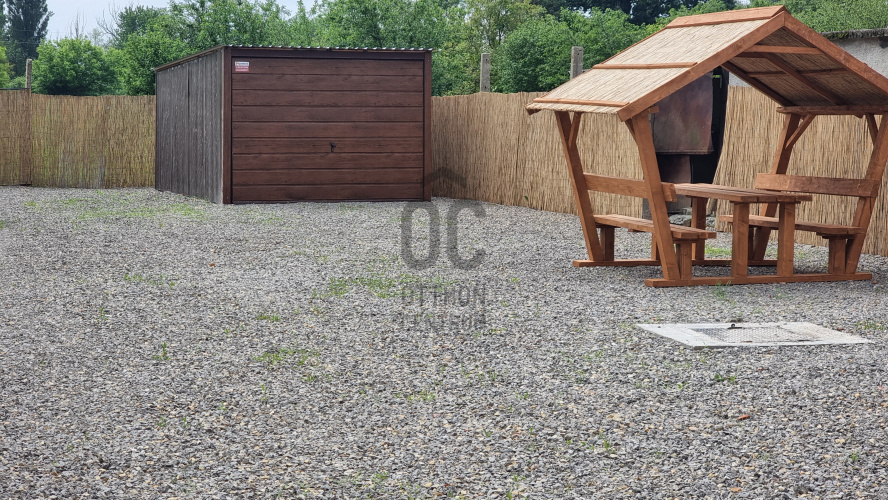 Az udvar frissen kavicsozva , garázzsal plusz kertikiülővel ellátva.