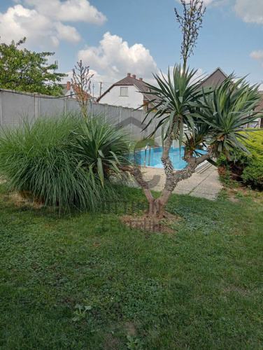 Kert -a fotókon látható- parkosított, gondozott zárt kerítéssel körülvett minden irányból. 7x3 méteres medence teljesen felszerelt gépházzal nyújt nyáron kellemes lazítást tulajdonosainak. Helyett kapott a medence közelében egy vizesblokkal felszerelt nyárilak, amely a pihenést ,kerti sütögetést, vendégek elszállásolását teszi lehetővé.