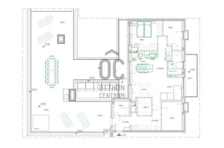 A panorámás terasz 125 m2 (+10 m2 a másik oldalon), ahol a vízvételi lehetőség biztosított, teherbírása pedig lehetővé teszi szauna, jakuzzi, télikert kiépítését is.