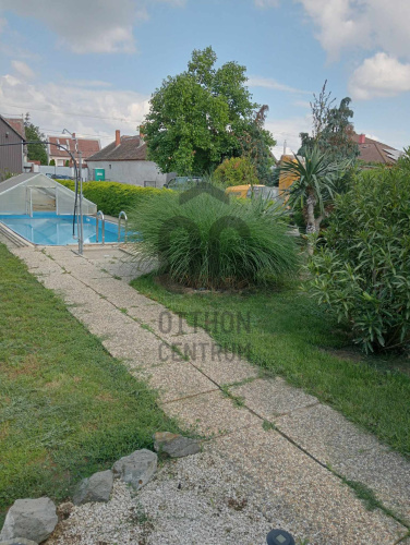 Kert -a fotókon látható- parkosított, gondozott zárt kerítéssel körülvett minden irányból. 7x3 méteres medence teljesen felszerelt gépházzal nyújt nyáron kellemes lazítást tulajdonosainak. Helyett kapott a medence közelében egy vizesblokkal felszerelt nyárilak, amely a pihenést ,kerti sütögetést, vendégek elszállásolását teszi lehetővé.