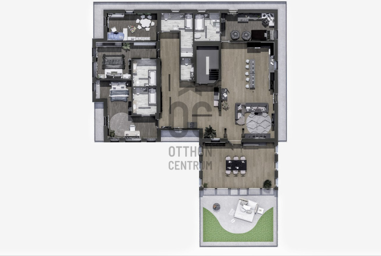 amely áll: nappali 22.29 m2, szoba 8.36m2, szoba 12.02m2, fürdő 5.31m2, fürdő 7.18 m2 + terasz 45 m2.