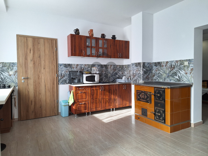 Fűtése hőszivattyús rendszerrel, (padlófűtéssel ), hangulatos cserépkályhával ( 7 kW ) és sütő- főző csempe tűzhellyel is megoldott. Ez utóbbi is jelentős meleget ad .
